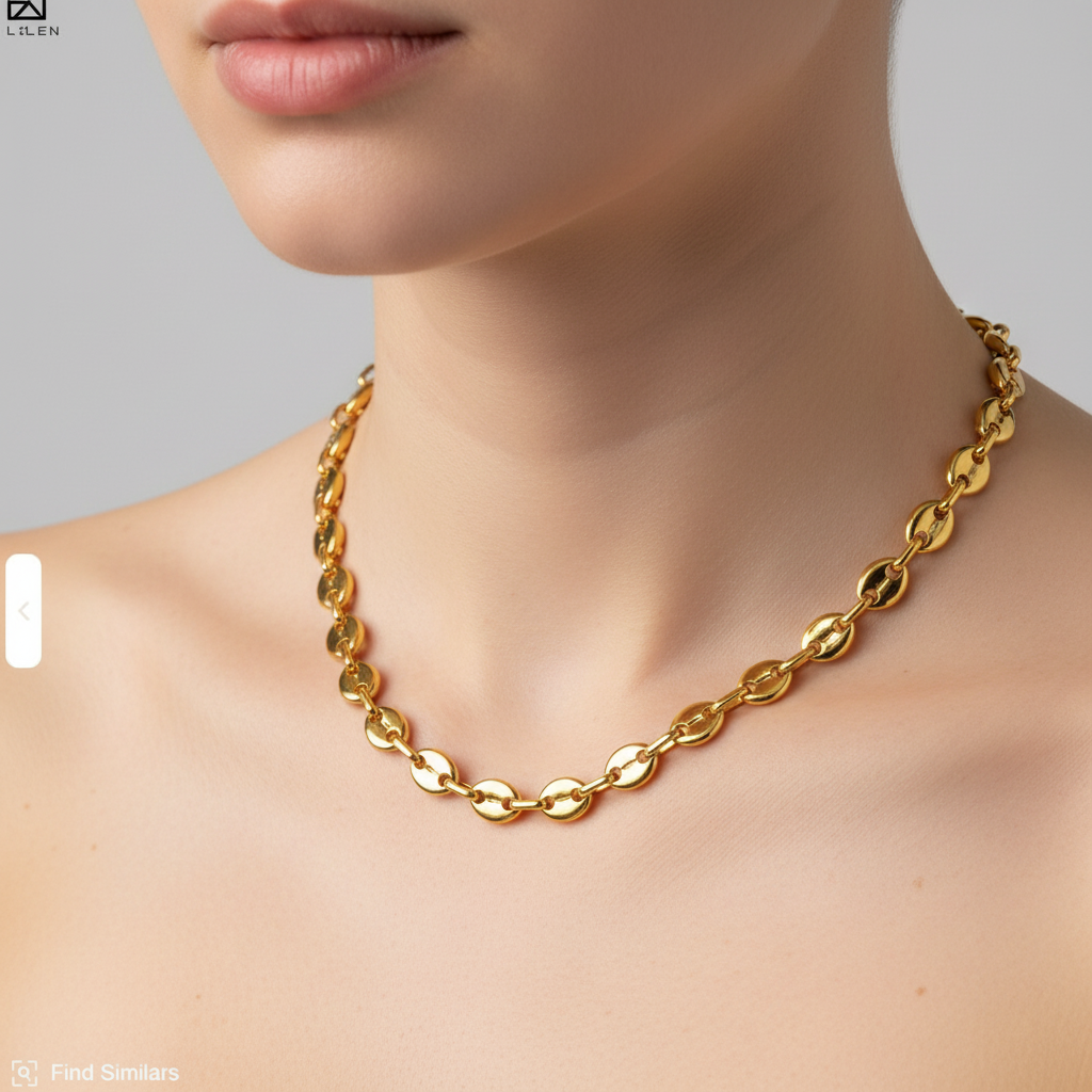 • Essential Coffee Bean Necklace — Longer, sculptural link for a confident foundation. Adjustable up to 20" • Horsebit Necklace (Gold & Silver) — Our iconic mixed-metal statement, polished and timeless. • Silver Beaded Chain — A fine stainless steel layer with spaced beads for subtle texture. Adjustable 16"–19.5"